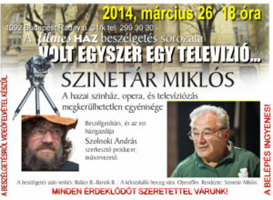 2014. első félévi programok a FilmesHázbanSzinetár Miklós (a hazai színház, opera és televíziózás nagy egyénisége) 2014.03.26. 18:00